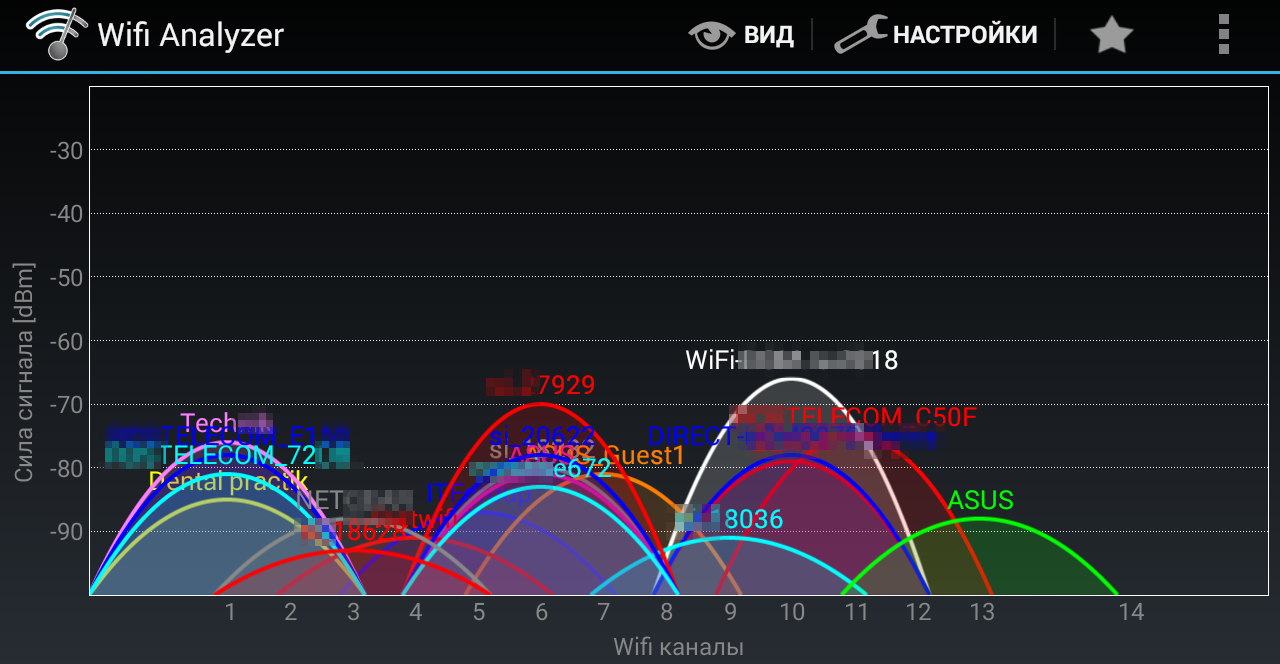 Всего у WiFi Analyzer пять режимов работы: график каналов, временной график, рейтинг каналов, список точек доступа и измеритель сигнала. Все названия говорят сами за себя. Первый график показывает, какие сети занимают определенные каналы Wi-Fi. Всего по стандарту 802.11g их четырнадцать в диапазоне 2,4 ГГц (с центральной частотой от 2412 до 2484 МГц), однако законодательство везде разное. Если в Японии можно использовать все четырнадцать каналов, то в России — первые тринадцать, а во Франции, к примеру, — только четыре.