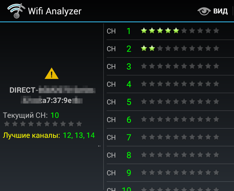 На вкладке «рейтинг каналов» автоматически определяется лучший канал и отображается таблица с рейтингом остальных. Чем больше звездочек, тем лучше. Здесь же можно увидеть текущий канал. Если он не совпадает с тем, который программа сочла лучшим, то стоит его сменить в настройках роутера.