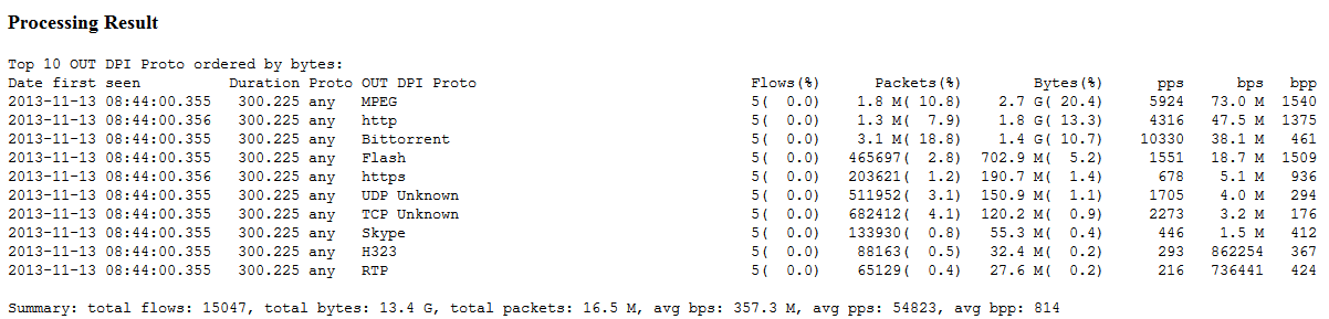 С систем DPI достаточно экспортировать статистику по протоколам и направлениям в формате NetFlow 5, так как он наиболее распространен и поддерживается большинством бесплатных и коммерческих средств для сбора и анализа статистики.