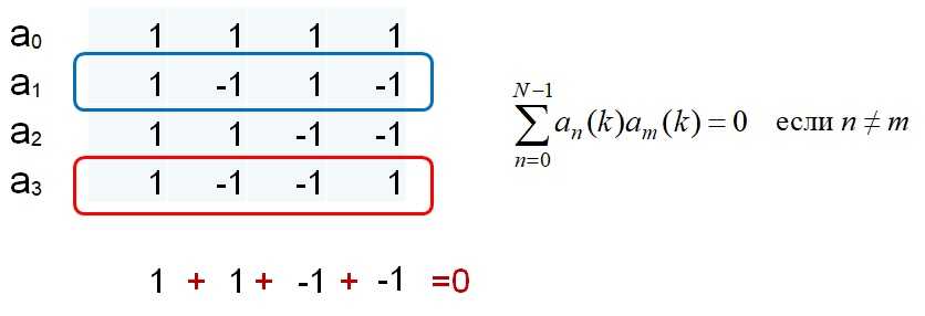 Разберемся каким свойство обладает последовательность Уолша, которая позволяет разделять один канал от другого.