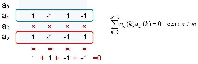 И результат перемножения суммируем. Если в результате получился 0, то такие коды являются ортогональными.