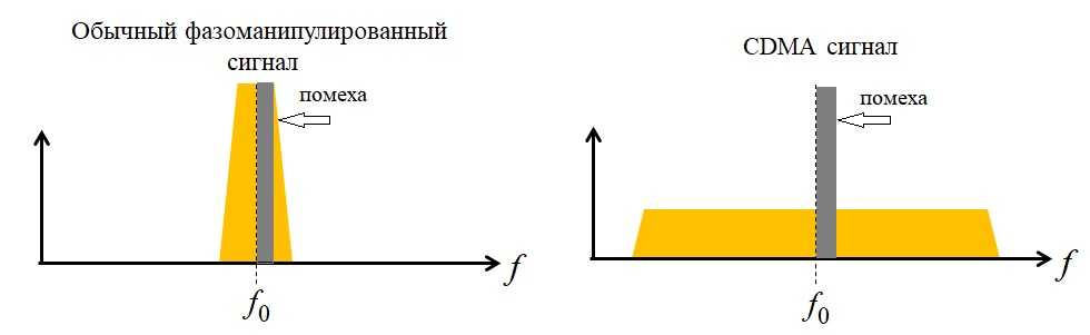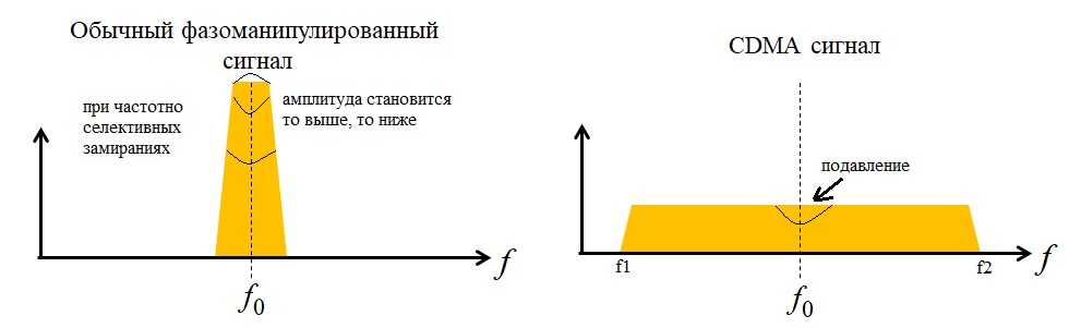 Системы с расширенным спектром более устойчивы к узкополосным помехам по частотно-селективным замираниям. Когда говорим о кодовом разделении каналов, расширение спектра происходит как побочное действие, потому что скорость манипуляции увеличивается.