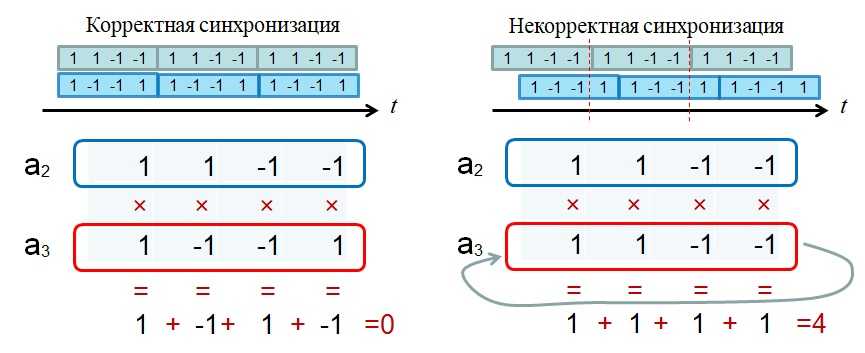 Почему рассинхронизация приводит к увеличению ошибки? Для корректной работы системы с кодовым разделением каналов необходима точная временная синхронизация всех приемников и передатчиков.