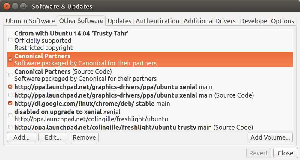 Первым делом следует обновить репозитории программного обеспечения. Чтобы сделать это, откройте меню «Dash» и пропишите в поиске «Обновление программного обеспечения». Зайдите в приложение, а после перейдите к вкладке «Другое ПО». Отметьте оба пункта: «Canonical Partners» и «Canonical Partners (Source Code)».
