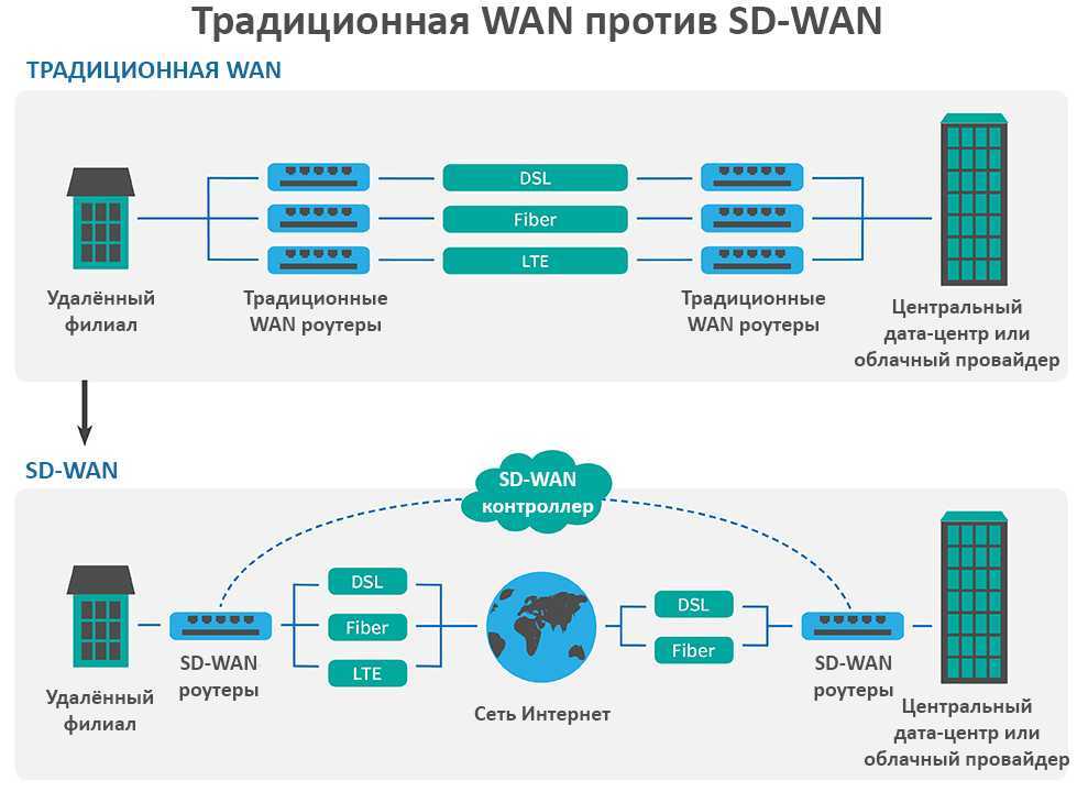 - В традиционных WAN-сетях динамические протоколы маршрутизации довольно грубо управляют трафиком, направляя его как поток воды по заданному руслу. SD-WAN абстрагирует технологии маршрутизации, безопасности и физические устройства, создавая логическое подключение, в котором можно как угодно управлять трафиком, гарантировать доставку пакетов, балансировать нагрузку и оптимизировать линки.