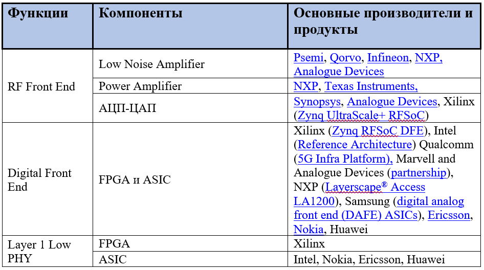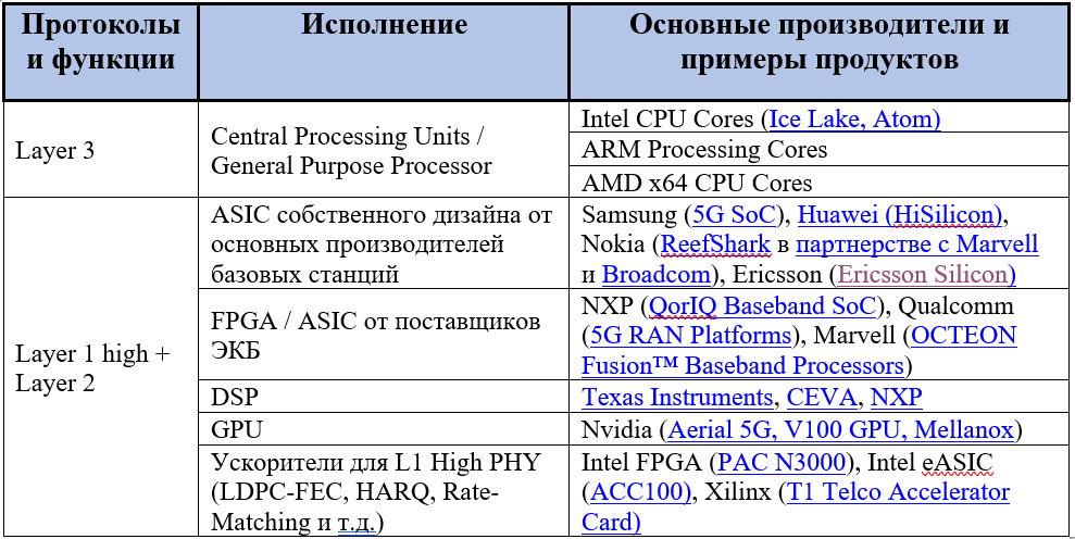 Данное устройство может быть реализовано как монолитный блок, либо разделено на два модуля (что обычно делается для виртуализированного исполнения). Какие тренды в отрасли на данный момент мы можем выделить: все крупнейшие производители (Nokia, Samsung, Ericsson, Huawei) дабы улучшить свои конкурентные преимущества в части производительности радио подсистемы активно вкладываются, вместе с технологическими партнерами, в разработку специализированных Систем-на-Кристалле / Специализированные Интегральные Схемы (ASIC-ов) и Ускорителей для наиболее эффективной работы самых требовательных и прожорливых операций 1 и 2 уровня ОСИ, в то время как Layer 3 очень часто отдается на откуп GPP процессорам: