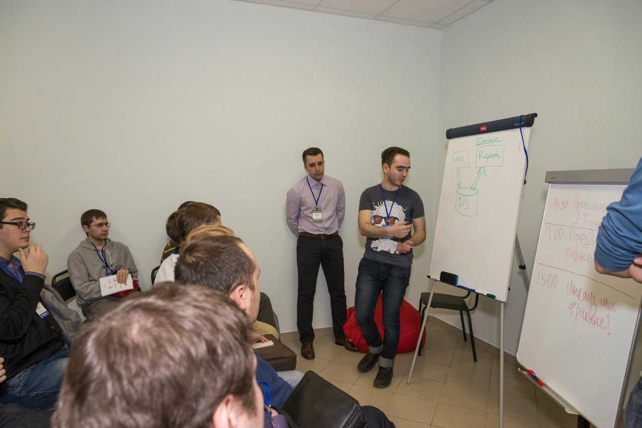 На нем мы разобрали несколько примеров с проблемными архитектурами. Любой мог подойти, нарисовать свою архитектуру и спросить куда идти дальше. Все участники давали очень ценные советы. Да и сами спрашивающие находили решения, пока рисовали, такой «эффект желтой уточки».