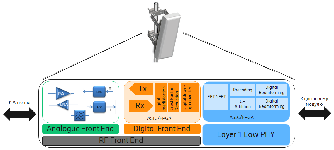 Layer 1 PHY low, включая Beamforming. В направлении к антенне, пользовательская информация, упакованная в пакеты данных, защищается от ошибок передачи в том числе за счет стандартизированных алгоритмов канального кодирования (Forward Error Correction), далее сигнал модулируется и трансформируется в радио форму. Для такой трансформации используется прямое и обратное Быстрое Преобразование Фурье (Fast Fourier Transforms), и инженеры знают из курса цифровой обработки сигналов в университете, что это достаточно сложная математическая задача, которая эффективно решается опять же с помощью специальных аппаратных ускорителей. Когда мы имеем дело с «массивными» MIMO системам, огромное количество передающихся параллельно массивов данных к большому числу антенн обрабатываются с помощью специализированных ускорителей функций бимформинга. Вся цепочка реализуется на программируемых цифровых процессорах (FPGA – ПЛИС) либо интегральных схемах.