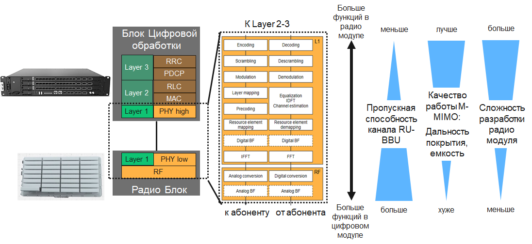 Вообще, то каким образом распределить L1-L2-L3 операции между цифровым модулем и радио-модулем – это целое искусство, которое напрямую будет влиять на схемотехнику, учитывая, что основная и самая интенсивная нагрузка во всей отрасли связи это именно Layer 1 в сетях радиодоступа: