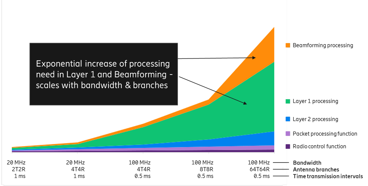 Также стоит отметить, что с развитием 5G в качестве радио-модуля + антенн все активнее начинают использовать Антенно-Интегрированные решения с большим количеством антенных элементов, что позволяет реализовывать сложные механизмы передачи Massive MIMO. Что в свою очередь существенно увеличивает интенсивность обработки сигналов именно в части Layer 1 / PHY: