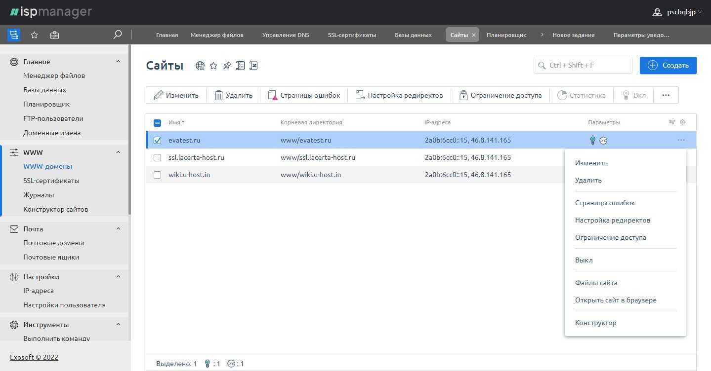 Управление сайтами осуществляется из вкладки «WWW-домены». На открывшейся странице «Сайты», можно добавлять, изменять, удалять домены, настраивать перенаправления. С этой же вкладки можно перейти в файловый менеджер выбранного сайта.