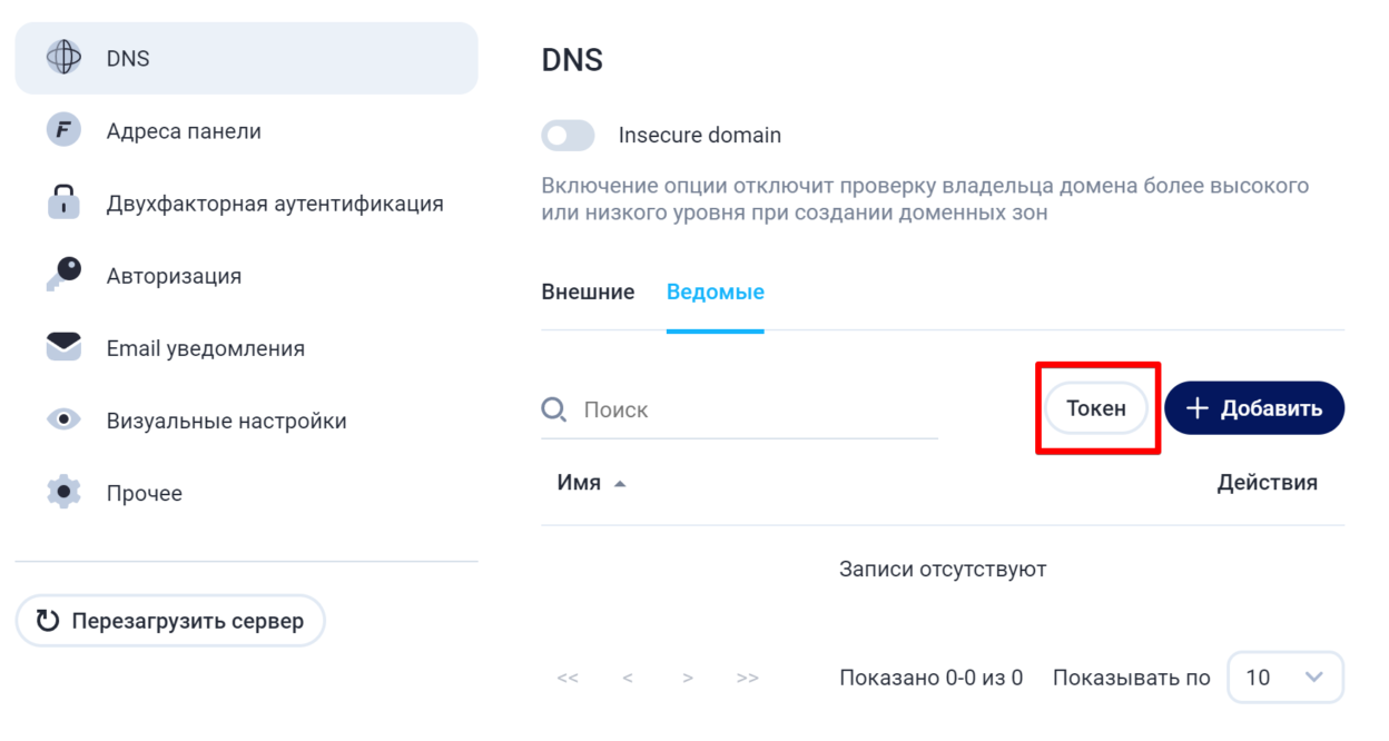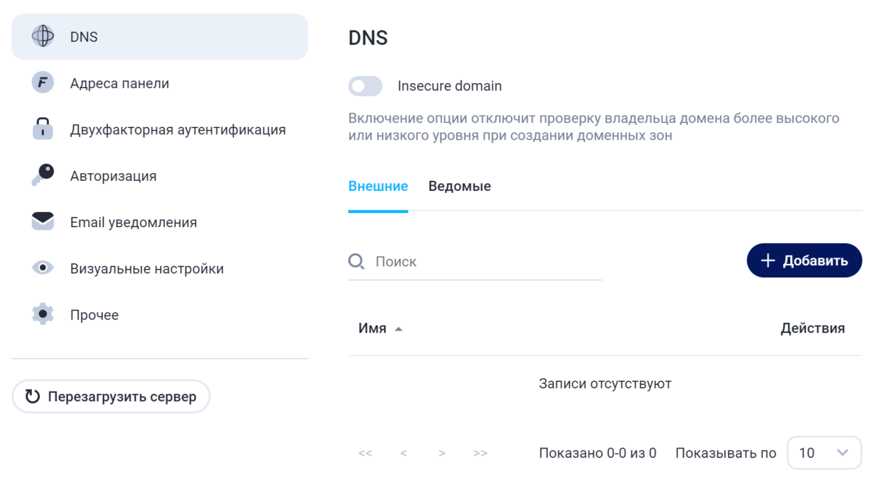 В разделе DNS Вы можете добавить аккаунты внешних DNS-провайдеров. Таким образом, DNS будут размещены у них, а не на Вашем сервере.