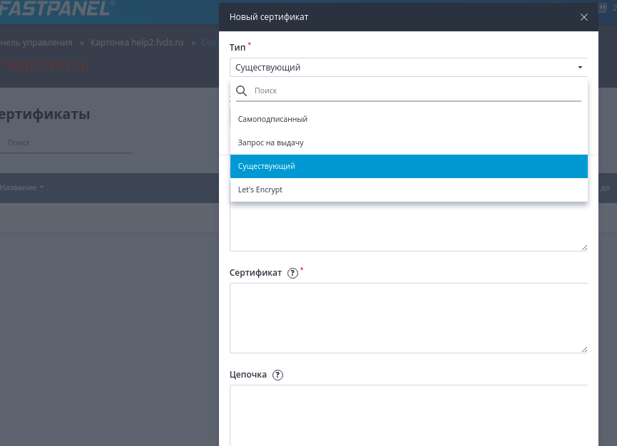 В разделе Адрес панели Вы можете привязать FASTPANEL к доменному имени (субдомену), а затем сгенерировать для него бесплатный SSL-сертификат Let’s Encrypt:
