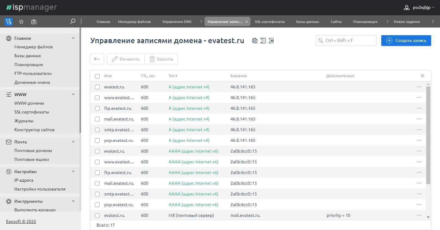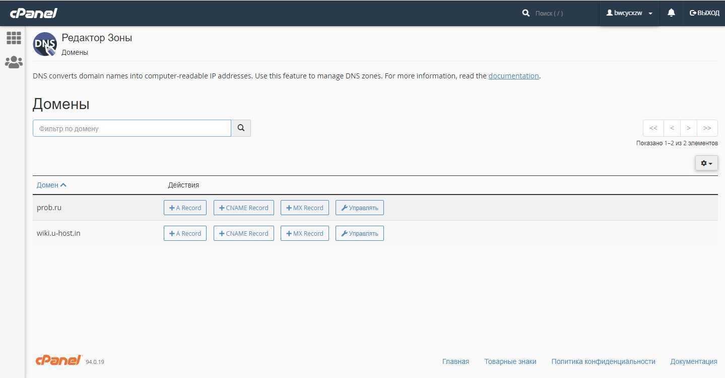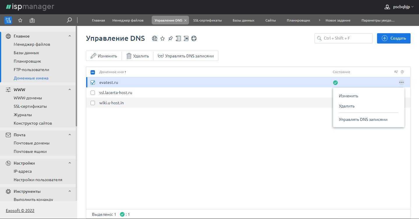 Раздел «Доменные имена» предназначен и для работы с доменами, и для управления DNS-записями.