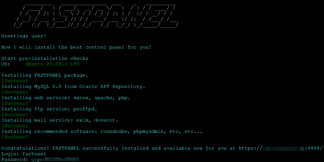 Вот эта фишка меня порадовала. Когда вы создаете новый сайт через эту панель, он автоматом предлагает создать базу данных, сам выбирает для неё имя, генерит пароли, и по окончанию выдаёт это всё вам! Браво fastpanel!