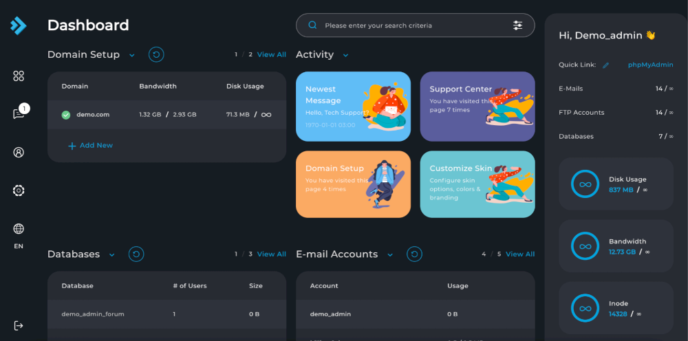 Еще одна популярная платная панель, стоимость зависит от выбранного плана с разным набором возможностей. Простая панель с базовым набором функций, имеет облегченный дизайн, подойдет новичкам. Сама панель нетребовательная к ресурсам сервера, очень “легкая”, как вариант на небольшой VPS сервер.