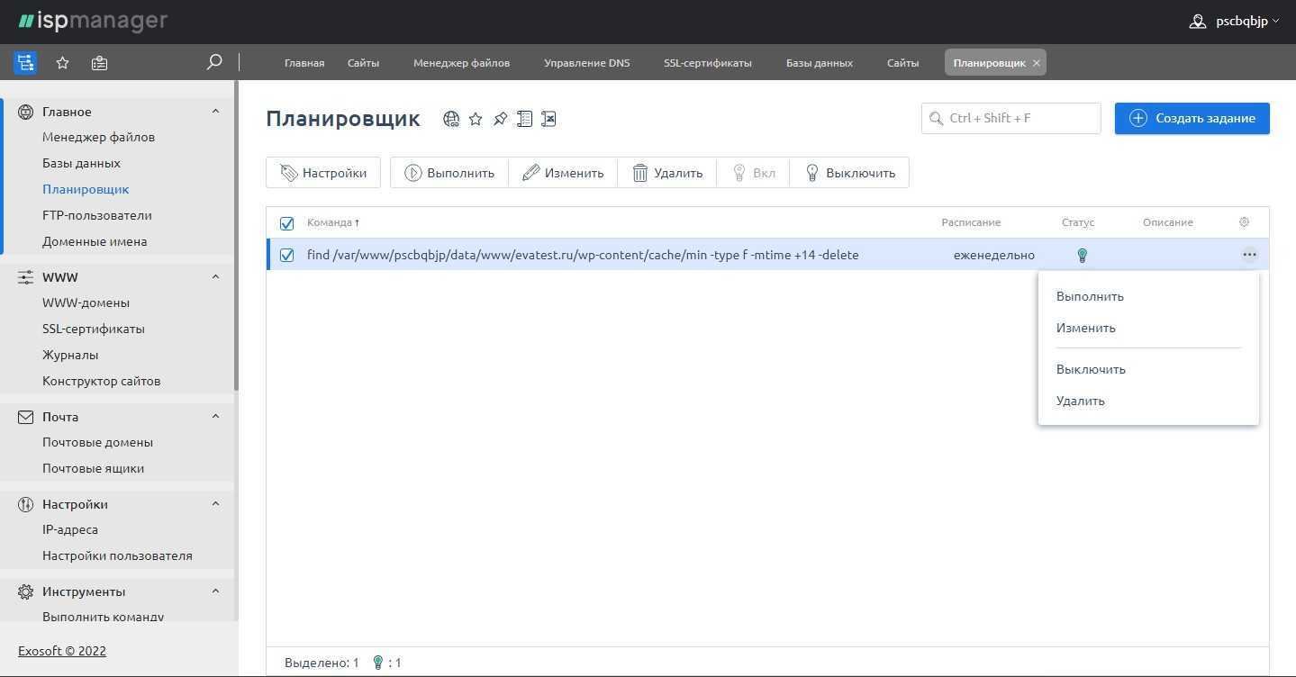 «Планировщик» (CRON) — здесь можно создавать и удалять задачи, изменять и временно отключать.