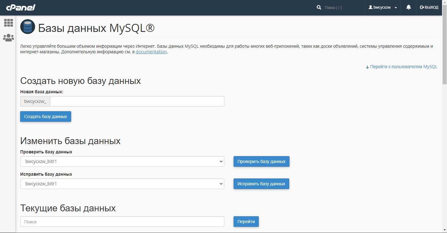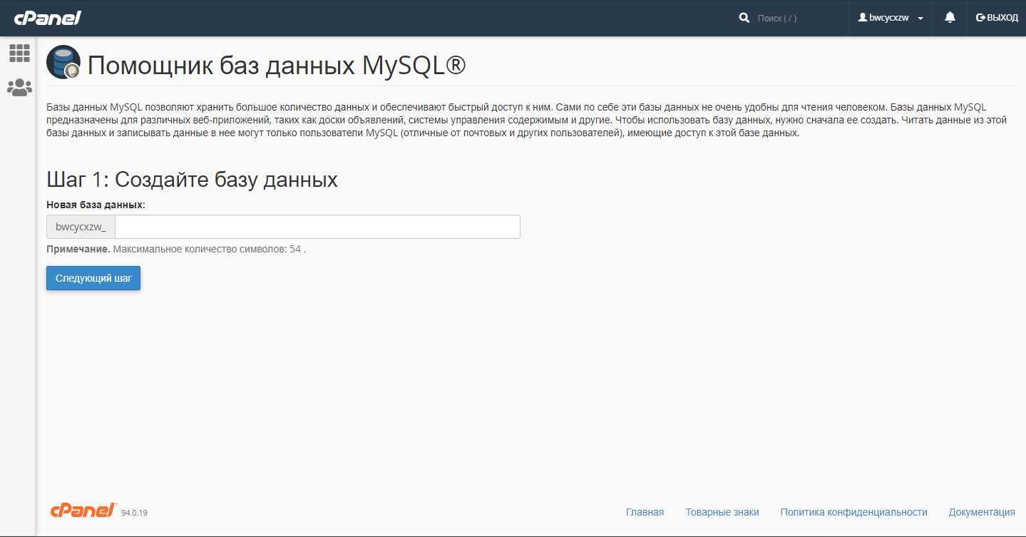 «Помощник баз данных MySQL» предназначен для создания новых баз (здесь пользователь автоматически связывается с базой данных, что многие забывают делать, если создают их раздельно через раздел «Базы данных MySQL»).