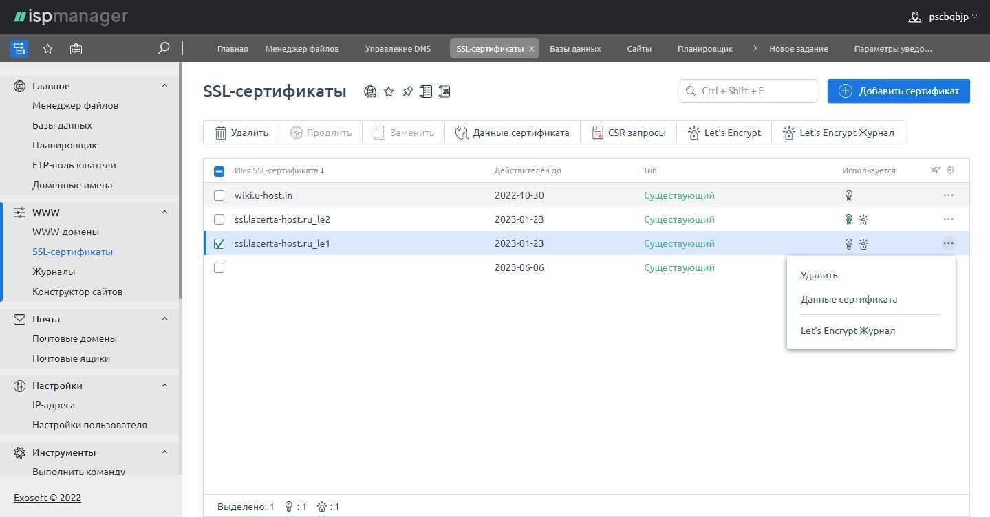 Управление SSL сертификатами производится в одноименном разделе. Здесь можно добавить, удалить, продлить сертификат, посмотреть информацию по нему. Панель поддерживает выпуск бесплатных сертификатов от Let’s Encrypt.