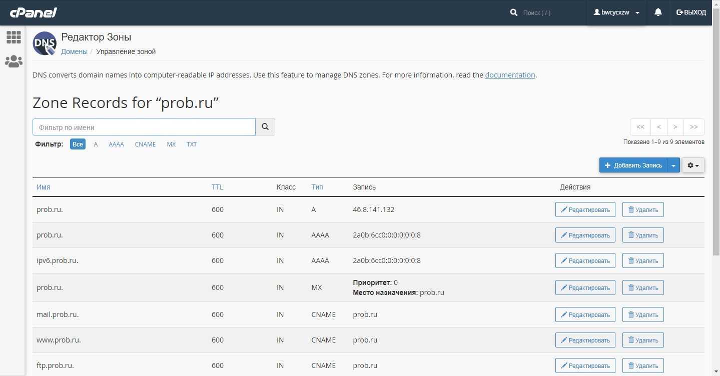 «Редактор зоны», расположенный в блоке «Домены», позволяет управлять DNS записями.