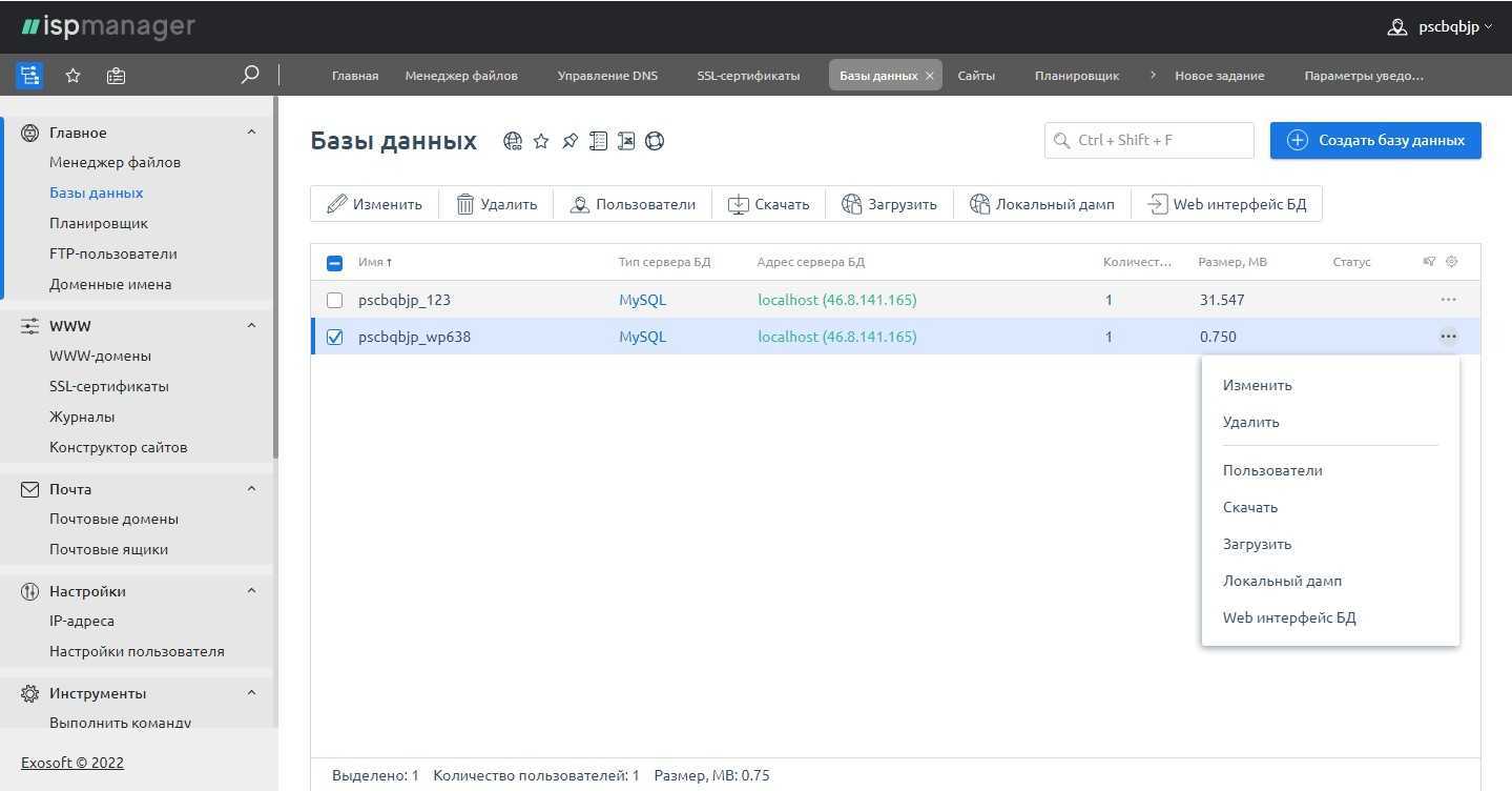 Раздел «Базы данных» рассчитан на операции с базами – их можно создавать, удалять, скачивать и загружать, восстанавливать из SQL файла на диске, просматривать, редактировать и удалять пользователей, отсюда же можно перейти в phpMyAdmin.