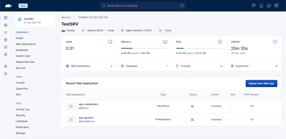 Платная панель управления для запуска сайтов в облаке или на виртуальных серверах. Управление сервером происходит через личный кабинет на сайте RunCloud.