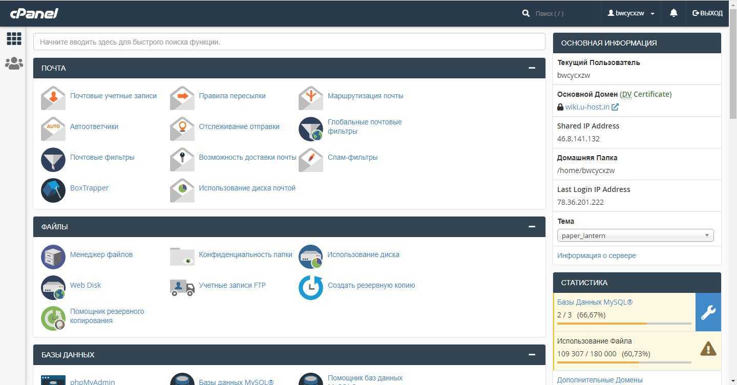 Интерфейс cPanel схож с DirectAdmin – все опции так же выведены блоками на главной, справа – виджет с информацией о системе. Структура более сложная для понимания, чем в предыдущих панелях. Ряд функций по смыслу дублирует друг друга, поэтому при первом знакомстве с панелью в ней трудно сориентироваться.