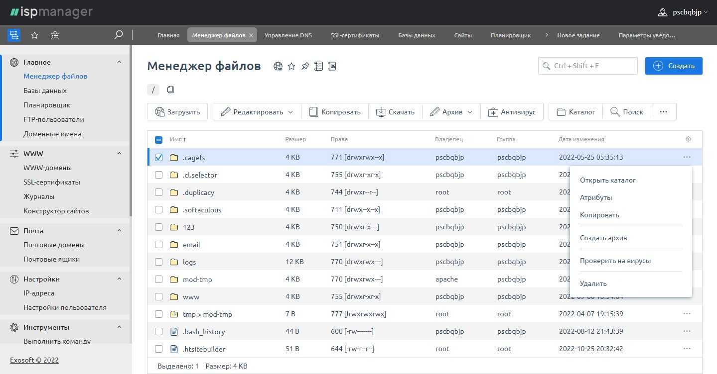Файлы сайтов находятся по пути «Менеджер файлов», каталог «WWW». Их можно скачивать, загружать, редактировать, удалять, копировать, перемещать, а также создавать и распаковывать архивы.