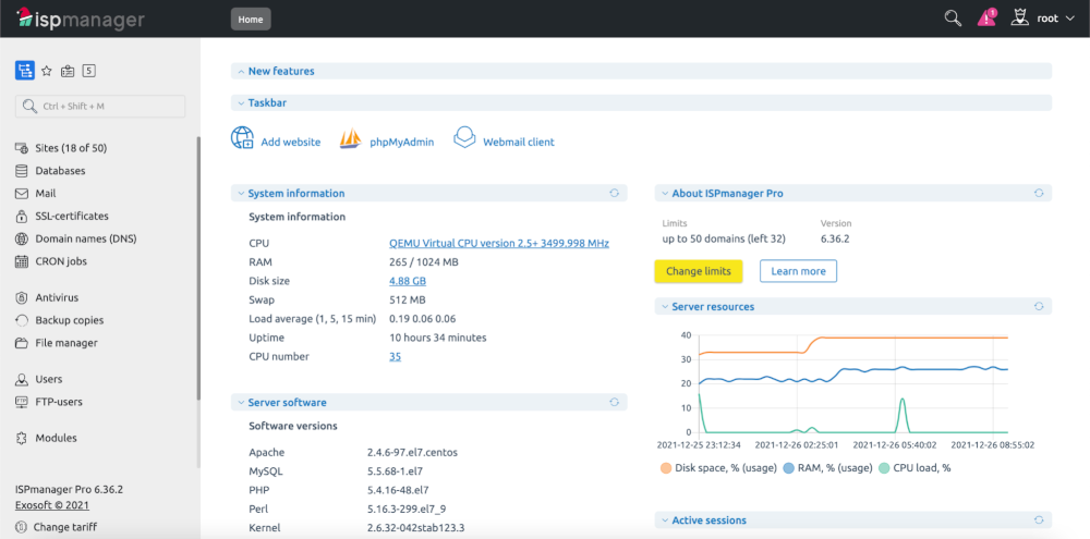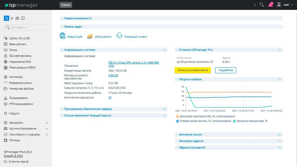 Простой и расширенный функционал панели поможет решить любые задачи по настройке виртуального сервера. Например, используя ISPmanager, вы можете: