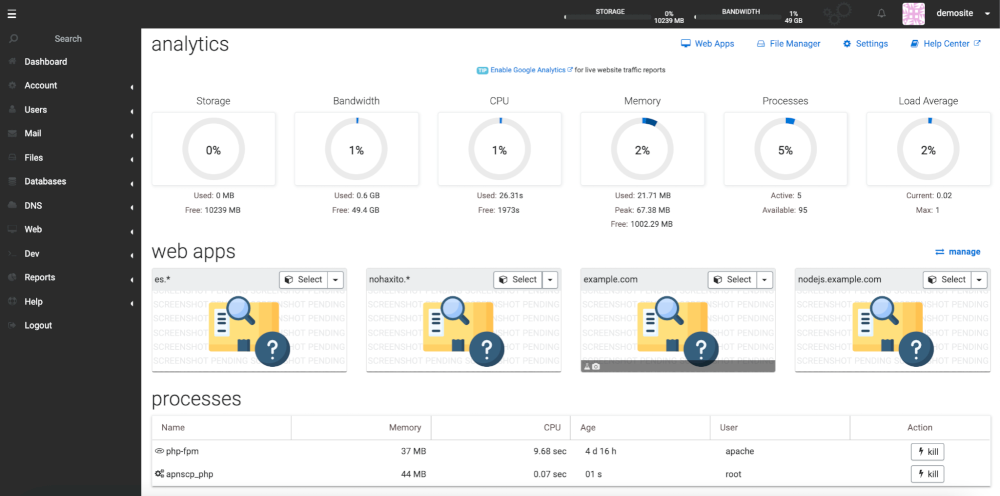 Еще один представитель бесплатных ПУ с открытым исходным кодом, поддерживает большинство дистрибутивов ОС. Данная панель позволит организовать управление своим сервером с небольшим количеством сайтов, но также заняться ресселингом и привлекать веб-мастеров на свой собственный хостинг. Конечно, есть и свои минусы, неподготовленному юзеру будет сложно разобраться в настройках, ведь при установке ПУ нужно редактировать системные файлы сервера.