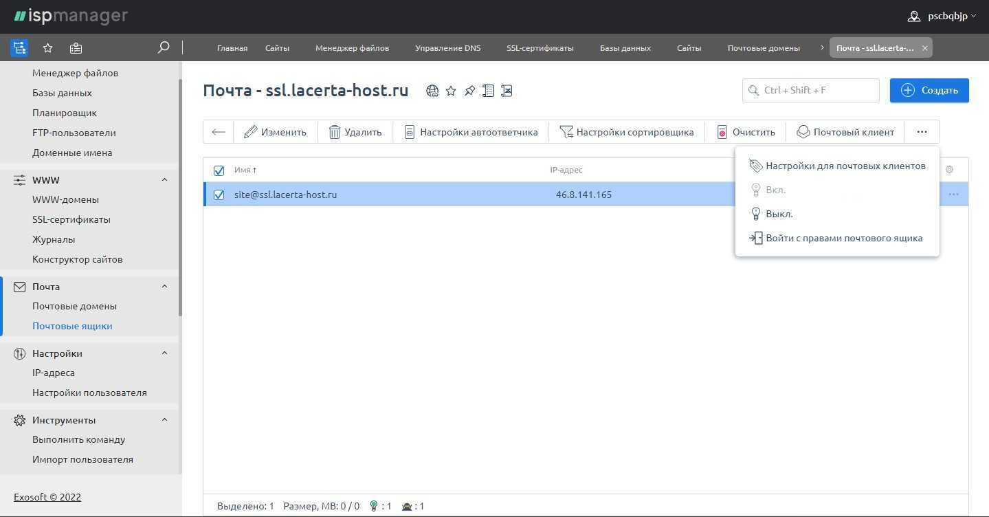 Управление почтовыми ящиками осуществляется из раздела «Почта». Перейдя в подраздел «Почтовые домены» или «Почтовые ящики», можно создать, удалить, изменить, очистить ящики, настроить сортировку писем, включить / отключить автоответчик. Читать и отправлять письма можно через веб-интерфейс Roundcube.