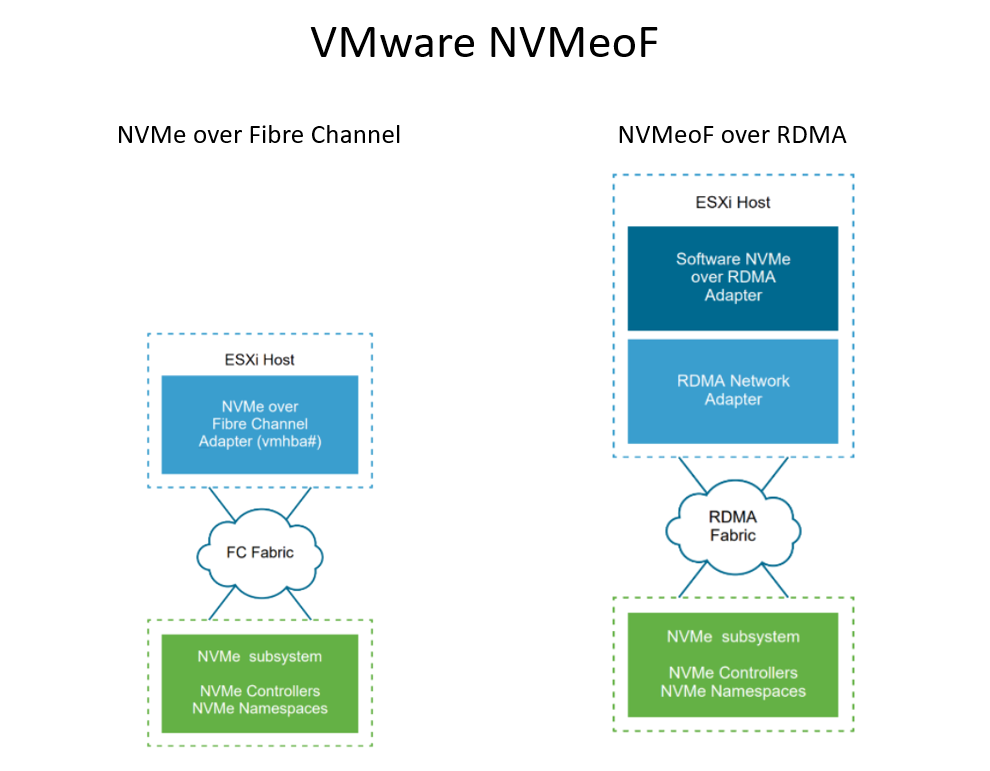 VMware добавила поддержку общего хранилища NVMe на базе NVMe-oF. Поддержка NVMe over Fibre Channel и NVMe over RDMA для внешних подключений появилась в vSphere 7.0. Хосты ESXi могут использовать RDMA over Converged Ethernet v2 (RoCE v2). Осуществление доступа к NVMe-хранилищу посредством RDMA выполняется хостом ESXi с помощью адаптера R-NIC на вашем хосте и адаптера хранения SW NVMe over RDMA. Для обнаружения хранилищ NVMe настроить необходимо оба адаптера.