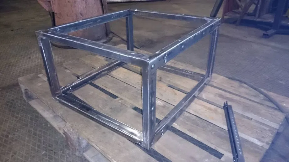 В боковых и верхних стенках также было принято решение сделать отверстия для вентиляции, а в одной из боковых граней – вырезать место для установки розетки. Все металлические элементы крепятся к каркасу из металлического уголка посредством резьбовых соединений.