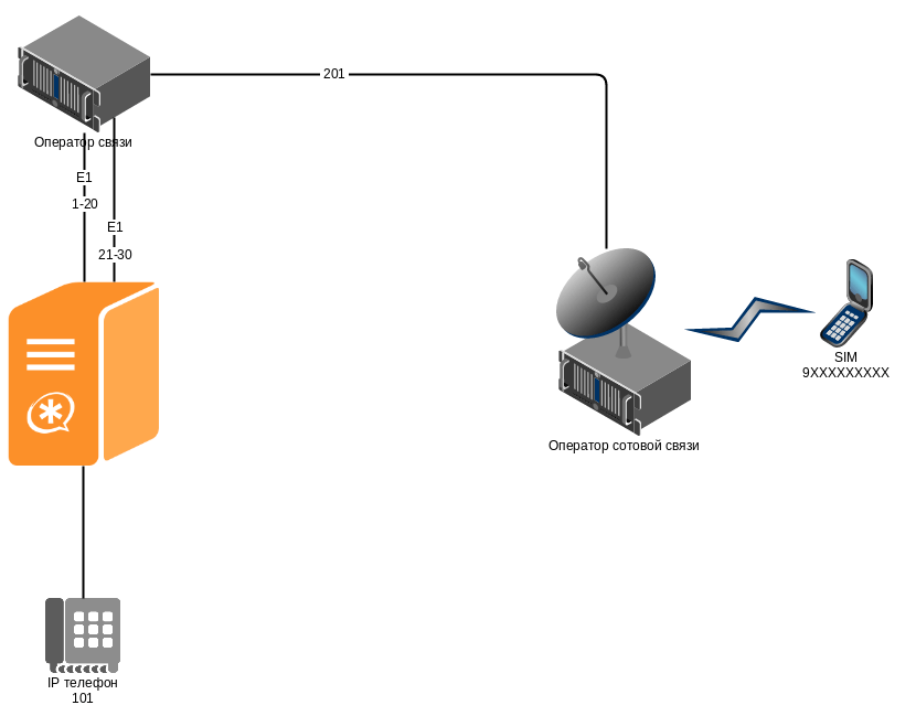 Если вы подключены через поток Е1 к оператору связи, который обладает своей собственной сетью подвижной связи, то можно получить услугу FMC и через Е1. Для этого необходимо согласовать параметры настроек потока Е1, где будут выделены таймслоты под данный вид связи. После чего настроить маршрутизацию на номера FMC, а также прием входящих с указанных таймслотов и направление их на правила обработки FMC вызовов,так как это уже будут не внешние вызовы. Схема выглядит так: