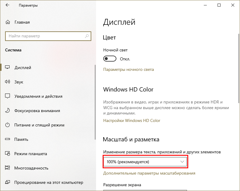 Далее нужно выйти из параметров и, не перезагружая устройство, снова их открыть. Зайдя в тот же раздел, нужно повторить процедуру, вернув изначальный масштаб. По завершению рекомендуется перезагрузить компьютер.