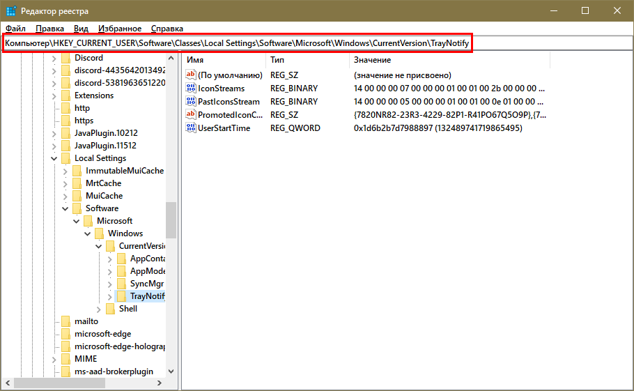 - Отыщите в редакторе реестра ветвь HKEY_CURRENT_USER\Software\Classes\LocalSettings\Software\Microsoft\Windows\CurrentVersion\TrayNotify.