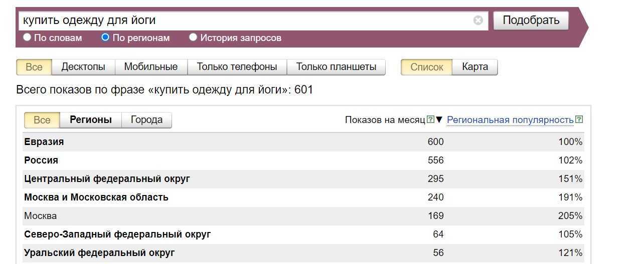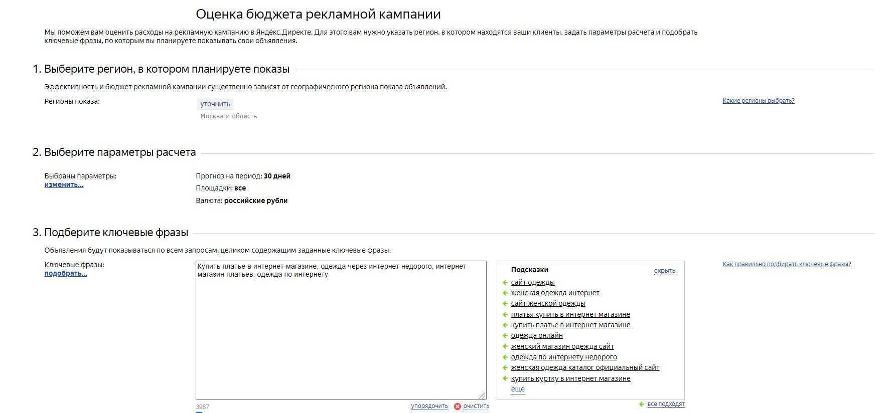 Например, вы применяете контекстную рекламу. Делать оценку в данном случае можно, используя «Прогноз бюджета» «Яндекс.Директа». Для анализа работы маркетолог выбирает регион, указывает параметры расчета и прописывает интересующие ключевые фразы.