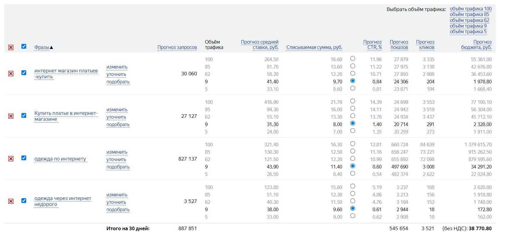 После этого производится автоматический расчет по заданным параметрам. Система анализирует данные и дает прогнозы по каждой фразе: CTR, показы, клики. Маркетологу остается проанализировать полученные данные и на их основе сделать собственный прогноз трафика.