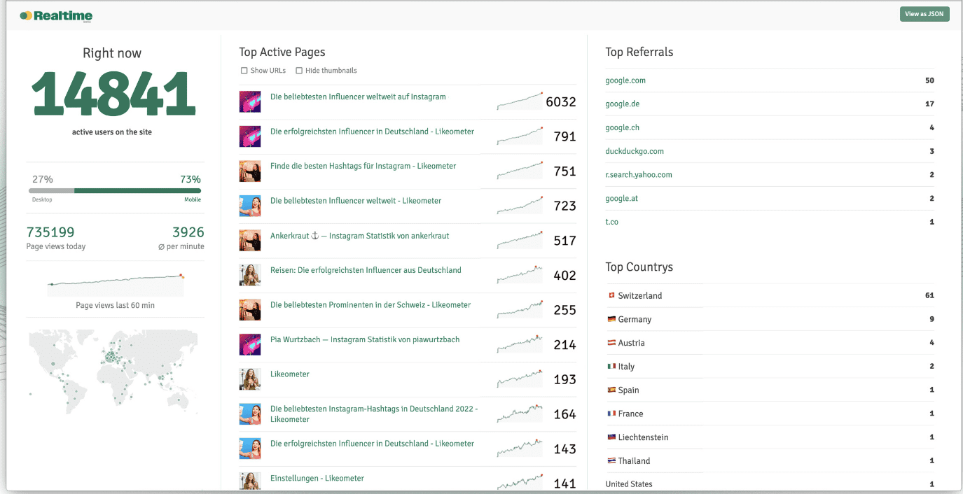 - Исторические диаграммы за последние три часа с пользователями в реальном времени на страницу
