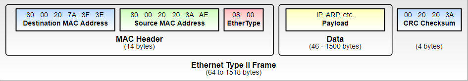 Он может иметь длину от 64 байт до 1518 байт. И состоит из :