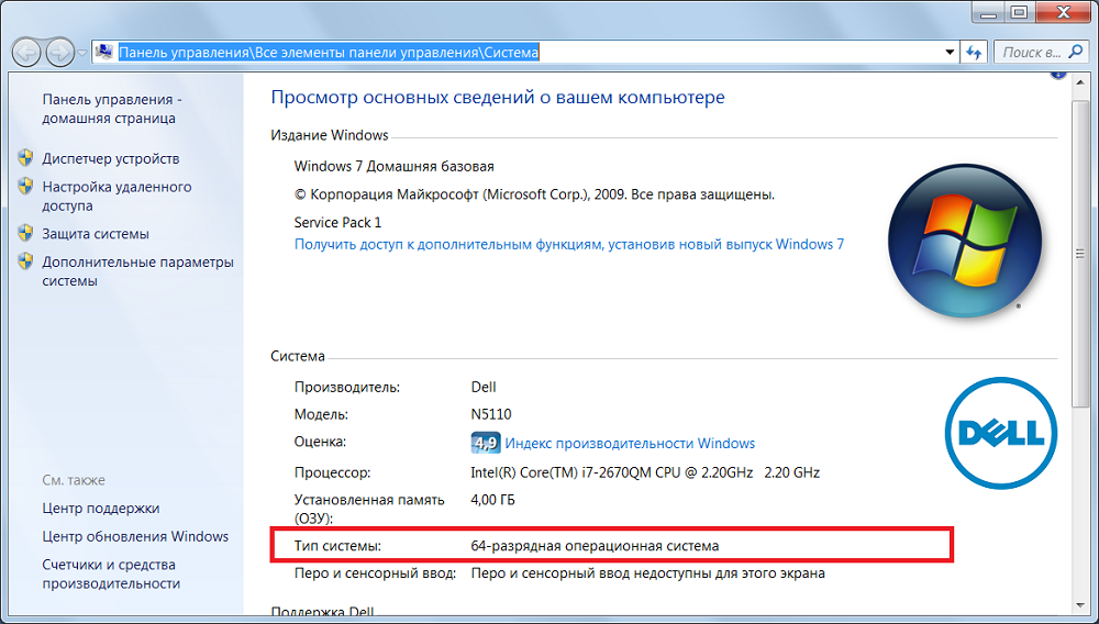 - Зажимаем кнопки Win + Pause и в обведённой строчке смотрим битность своей ОС.