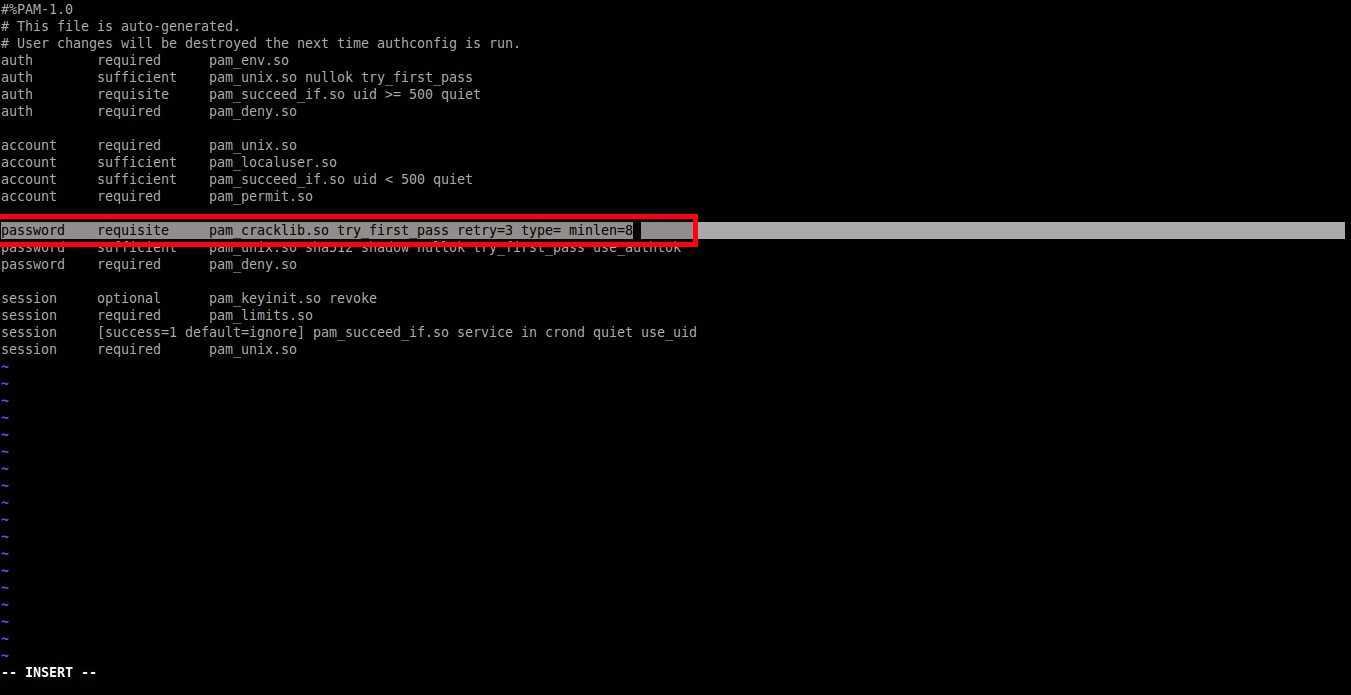 password requisite pam_cracklib.so try_first_pass retry=3 type= minlen=8