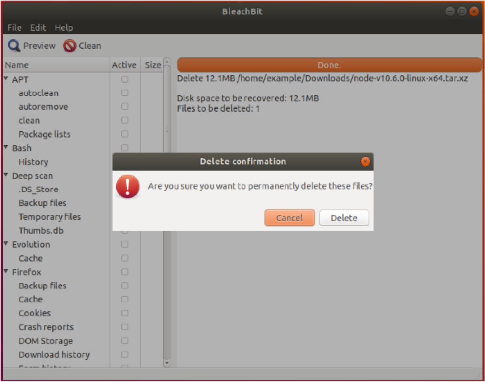 BleachBit запросит у вас подтверждение проведения операции, в результате которой выбранные файлы/папки будут безвозвратно удалены. Нажмите кнопку «Delete» (удалить).
