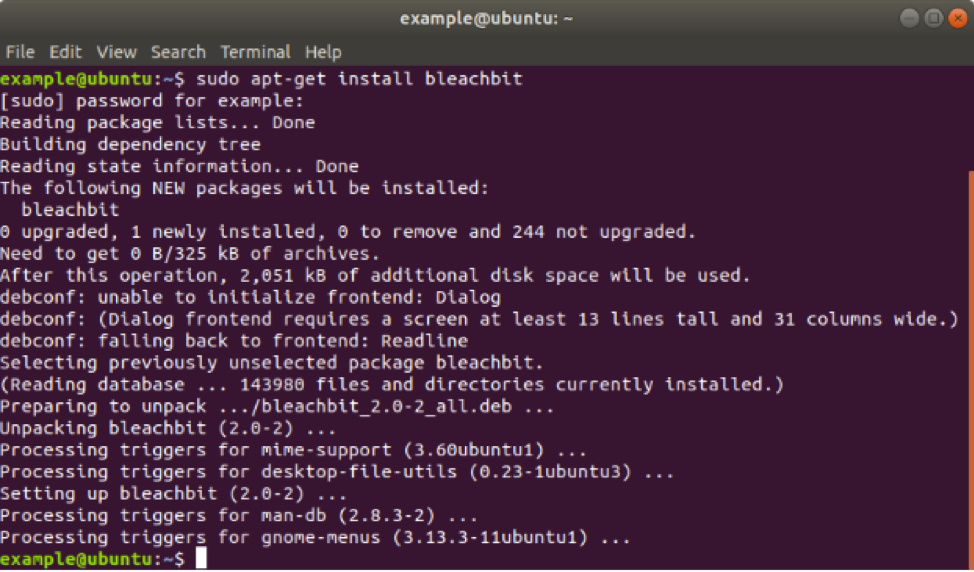 Вы увидите процесс установки BleachBit, по завершению которой вы вернетесь к управлению командной строкой.