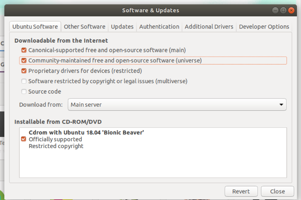 В открывшемся окне установите галочку напротив пункта «Community-maintained free and open-source software (universe)» (Поддерживаемое сообществом бесплатное ПО , основанное на открытом исходном коде), затем нажмите «Close» (Закрыть) и «Reload» (Перезагрузить). Если галочка уже установлена, можете просто нажать «Close» (Закрыть).