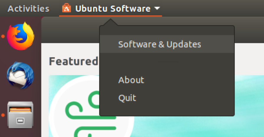 По умолчанию BleachBit не будет указан в списке. Для того, чтобы это приложение появилось в списке, необходимо включить поддержку пакетов, поддерживаемых сообществом. Нажмите на надпись «Ubuntu Software» в верхней части меню и выберите пункт «Software & Updates» (ПО и обновления).