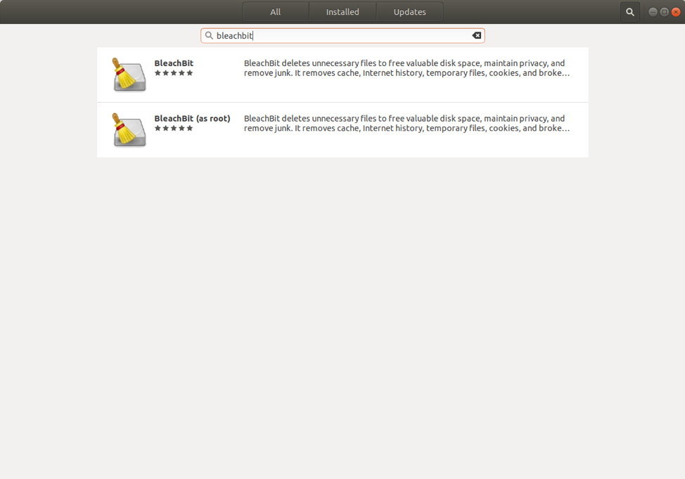 Теперь вы можете найти BleachBit в приложении Ubuntu Software с помощью поиска (нажмите на значок с изображением увеличительного стекла в верхнем правом углу окна).