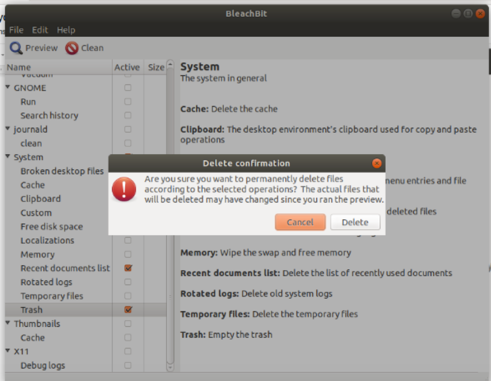 BleachBit запросит у вас подтверждение. Нажмите на кнопку «Delete» (Удалить).