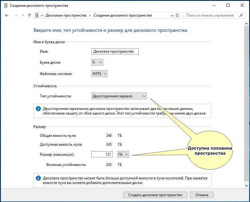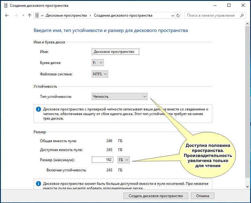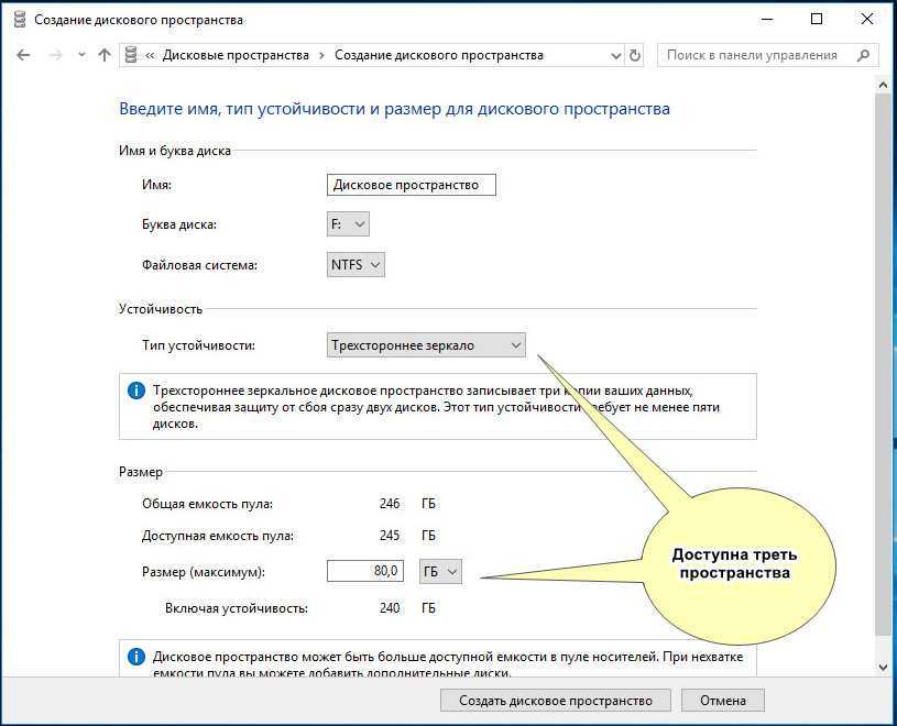 И хранить на этом разделе что-то не особо важное в случае конфигурации без отказоустойчивости или, наоборот, что-то важное, обеспечив этим данным двух- или трёхсторонние зеркала. Дисковые пространства могут быть сформированы из разного типа устройств информации – внутренних SATA, SAS и внешних USB-HDD