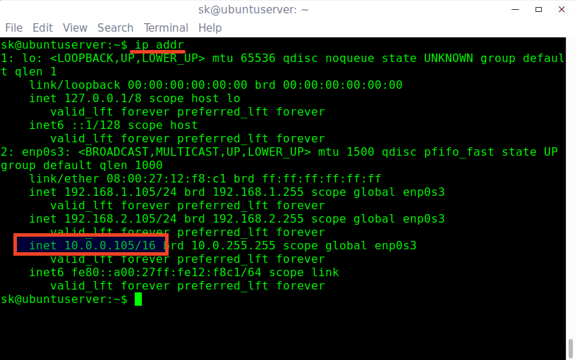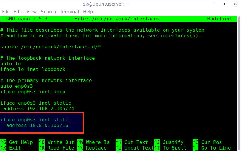 auto enp0s3 iface enp0s3 inet static address 10.0.0.6 netmask 255.255.255.0 network 10.0.0.1 broadcast 10.0.0.255 gateway 10.0.0.1